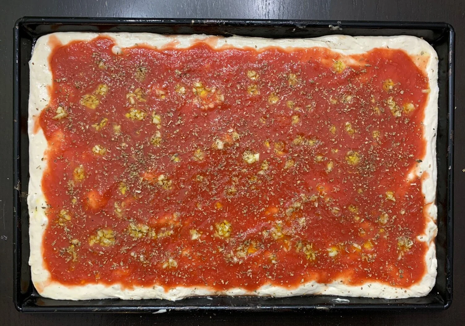 1. Prepare and stretch dough as described in the Simple Sicilian Dough Recipe.